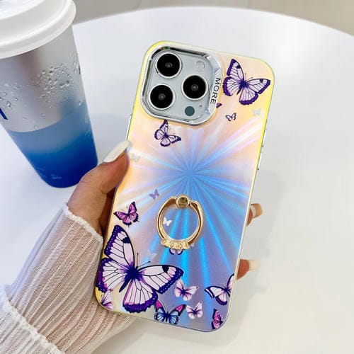 Estuche para Teléfono iPhone 15 Pro Max con Soporte Anillo Mariposa Láser Galvanoplastia (Morado)
