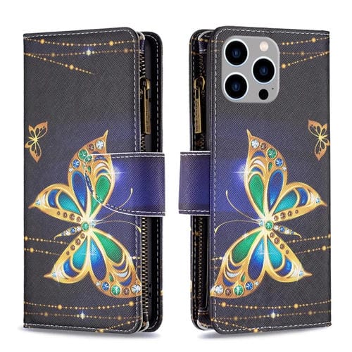 For iPhone 15 Pro Max Colored Drawing Pattern Zipper Leather Phone Case (Big Butterfly)