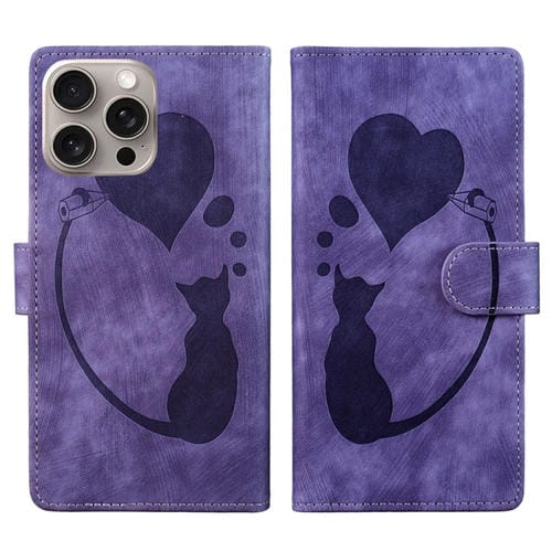 Funda de Cuero para iPhone 15 Pro Max Pen Heart Cat en Relieve (Púrpura)