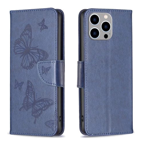 Funda de Cuero para iPhone 15 Pro Max Relieve Dos Mariposas Patrón (Azul)