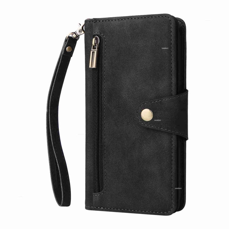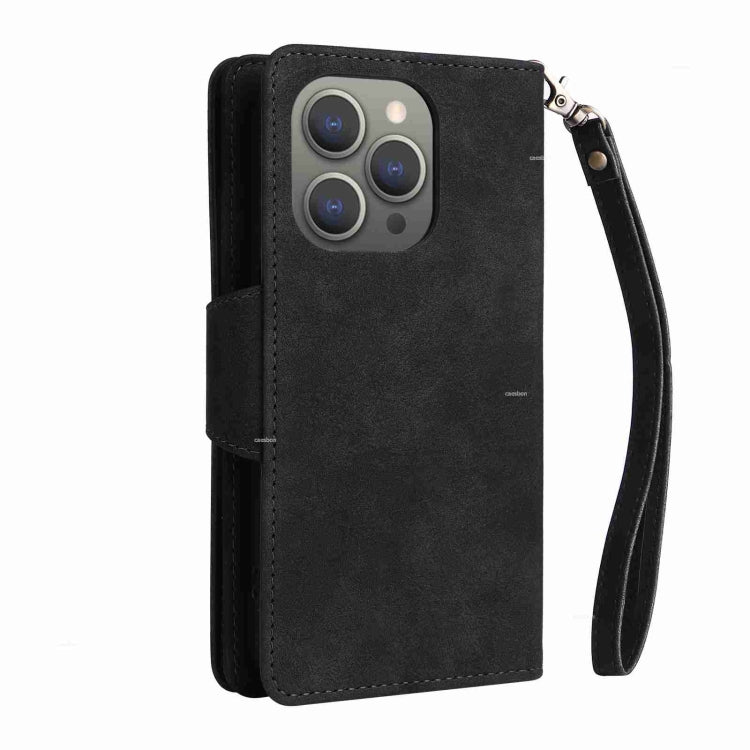 Funda de Cuero para iPhone 15 Pro con Hebilla Remache y Tres Pliegues para 9 Tarjetas (Negro)