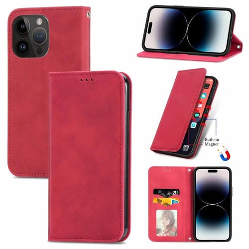 Funda para iPhone 15 Pro Retro Skin Feel Flip Magnética de Cuero (Rojo)