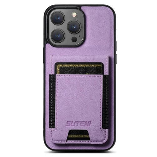 Funda para Teléfono Suteni H03 para iPhone 15 Pro con Soporte para Tarjeta de Cuero Litchi (Púrpura)