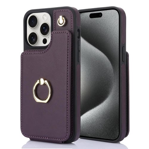 Funda para teléfono Ym005 Skin Feel Card Bag para iPhone 15 Pro con cordón largo (Púrpura Oscuro)
