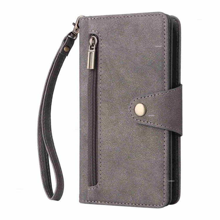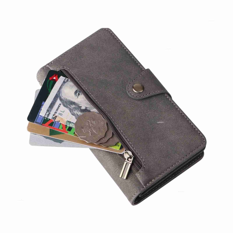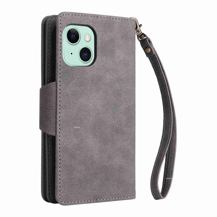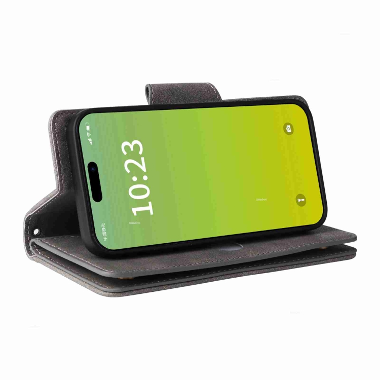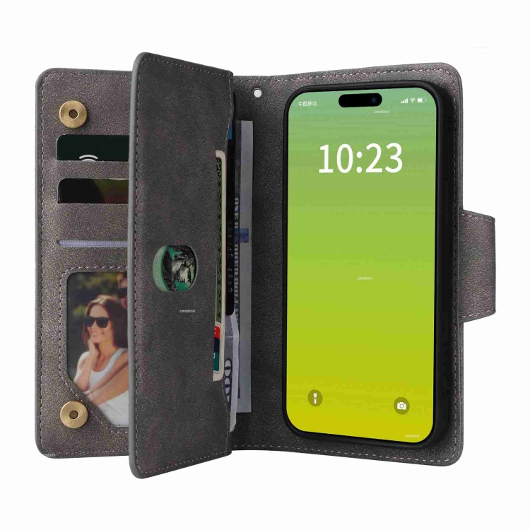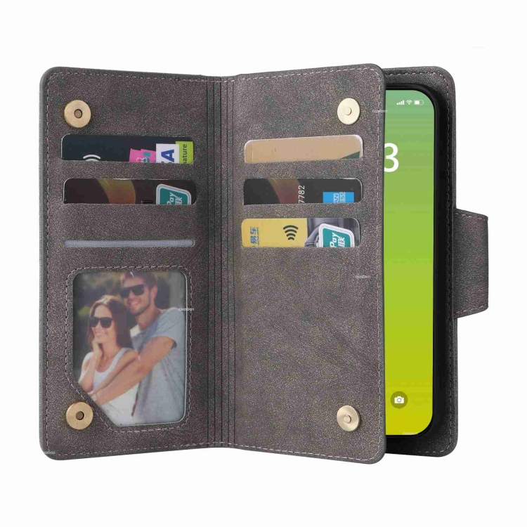 Funda de Cuero para iPhone 15 Remache Hebilla 9 Tarjetas con Tres Pliegues (Gris)