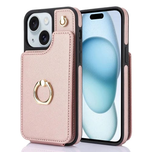 For iPhone 15 YM005 Skin Feel Card Bag Phone Case with Long Lanyard (Rose Gold)