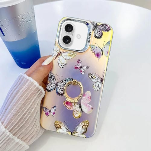 Estuche para Teléfono iPhone 16 con Soporte para Anillo de Mariposa Láser con Galvanoplastia (Mariposas Rosadas)