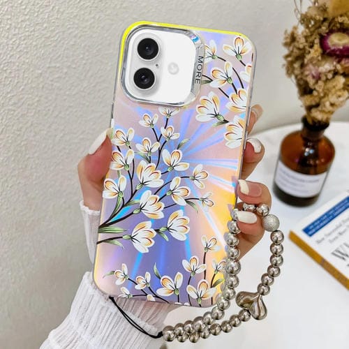 Estuche para teléfono iPhone 16 Plus con flor láser galvanizada y correa para la muñeca (Pear Blossom Ah17)