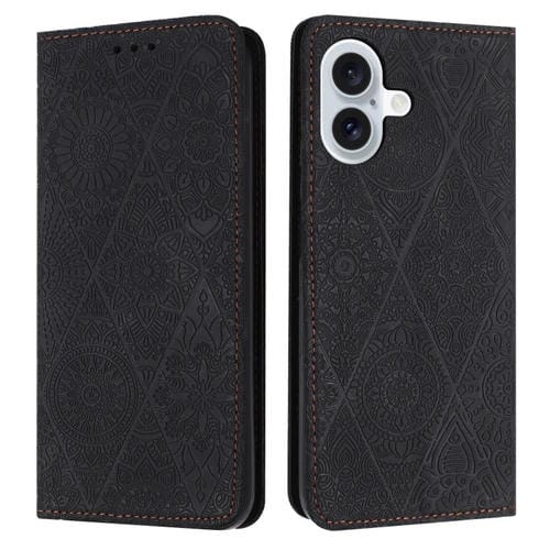 Funda de Teléfono iPhone 16 Plus Cuero Adsorción Relieve Étnico (Negro)