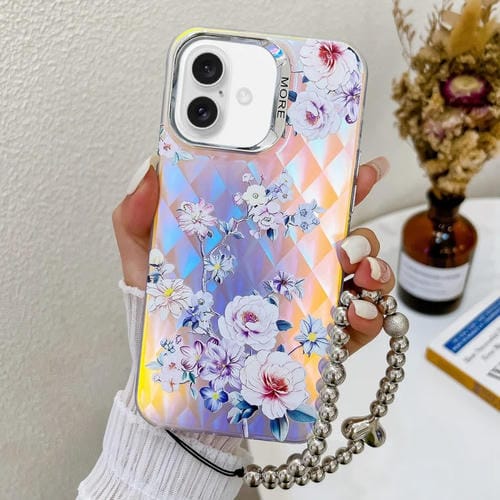 Funda para Teléfono iPhone 16 Plus con Flor Láser Galvanizada y Correa para Muñeca (Rose)