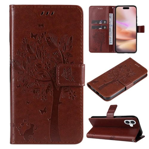 Funda para Teléfono iPhone 16 Plus Cuero con Tapa Patrón en Relieve Árbol y Gato (Café)