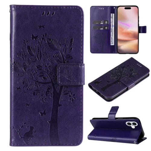 Funda para Teléfono iPhone 16 Plus Cuero con Tapa Patrón En Relieve Árbol y Gato (Púrpura)