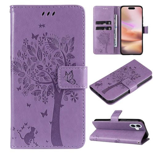 Funda para Teléfono iPhone 16 Plus de Cuero con Tapa y Patrón en Relieve de Árbol y Gato (Púrpura Claro)