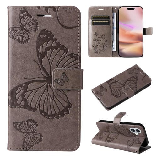 Funda para Teléfono iPhone 16 Plus Cuero con Tapa y Patrón En Relieve Mariposa 3D (Gris)