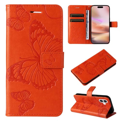 Funda para Teléfono iPhone 16 Plus Cuero con Tapa y Patrón En Relieve de Mariposa 3D (Naranja)