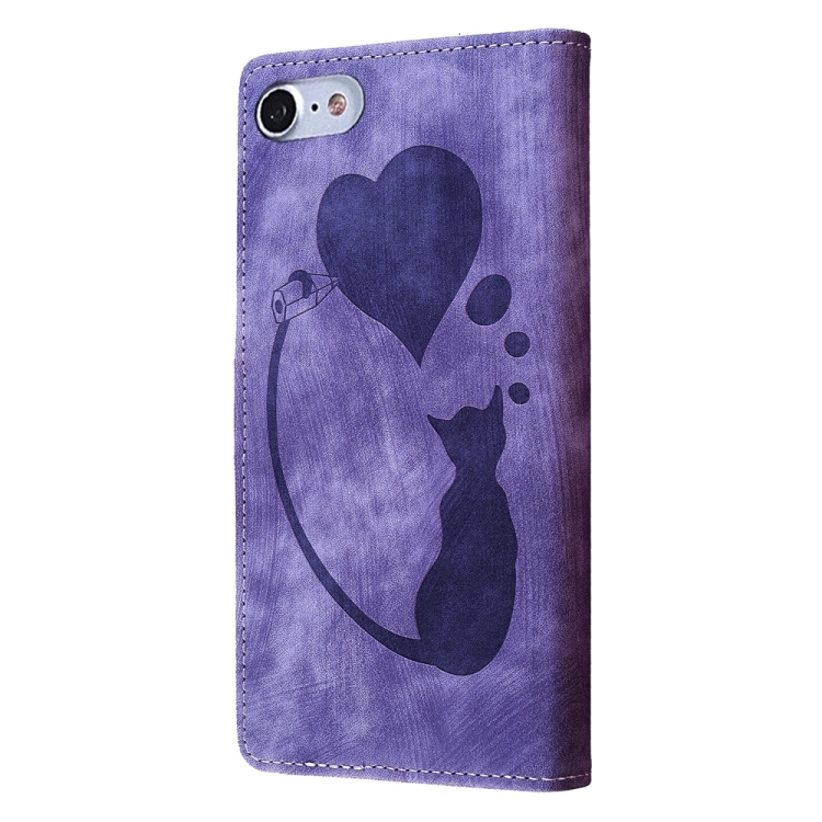 Estuche para Teléfono iPhone 7/8/Se 2022 Cuero Relieve Gato y Corazón (Púrpura)