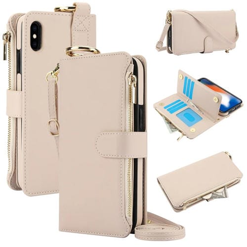 Estuche para teléfono iPhone X / Xs cuero con billetera multifuncional y anillo cruzado (Blanco)