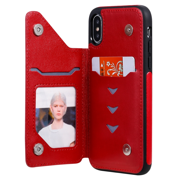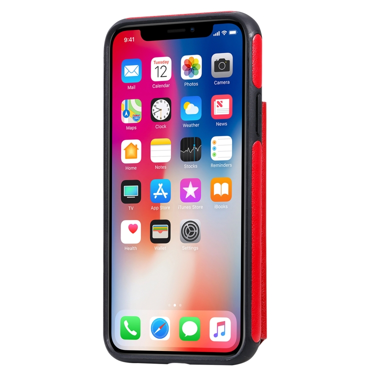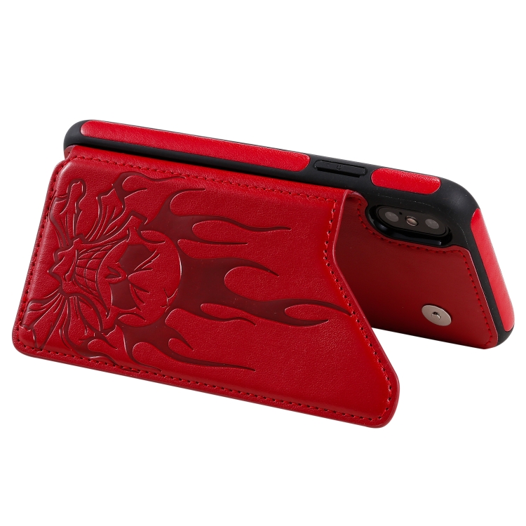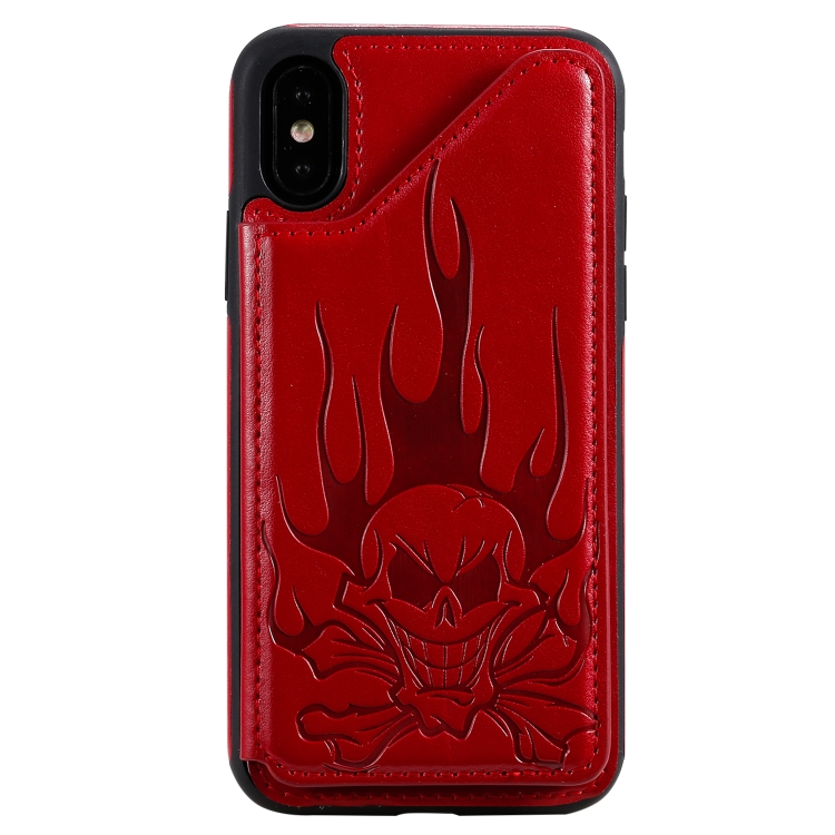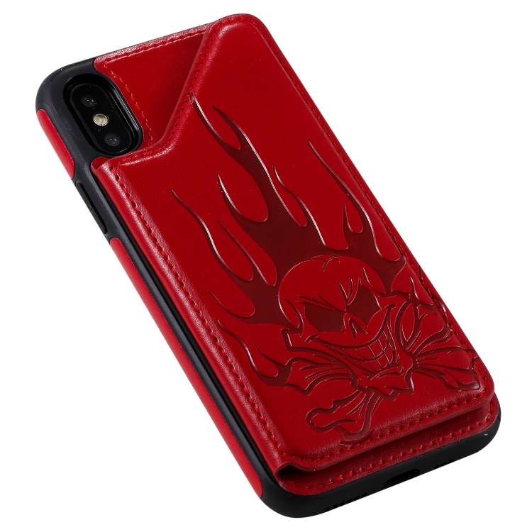 Estuche protector para iPhone X / Xs con estampado de cabeza de calavera, a prueba de golpes, soporte y ranuras para tarjetas (Rojo)