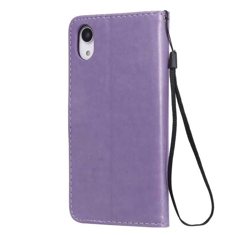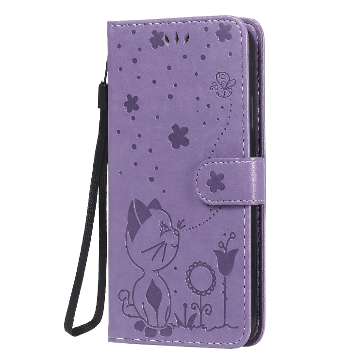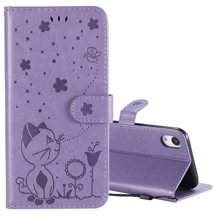Funda de cuero iPhone Xr Cat Bee patrón en relieve tapa horizontal a prueba de golpes con soporte y ranuras para tarjetas y billetera (Púrpura)