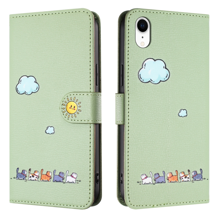 Funda de Cuero para Teléfono iPhone Xr con Gatos de Dibujos Animados (Verde)