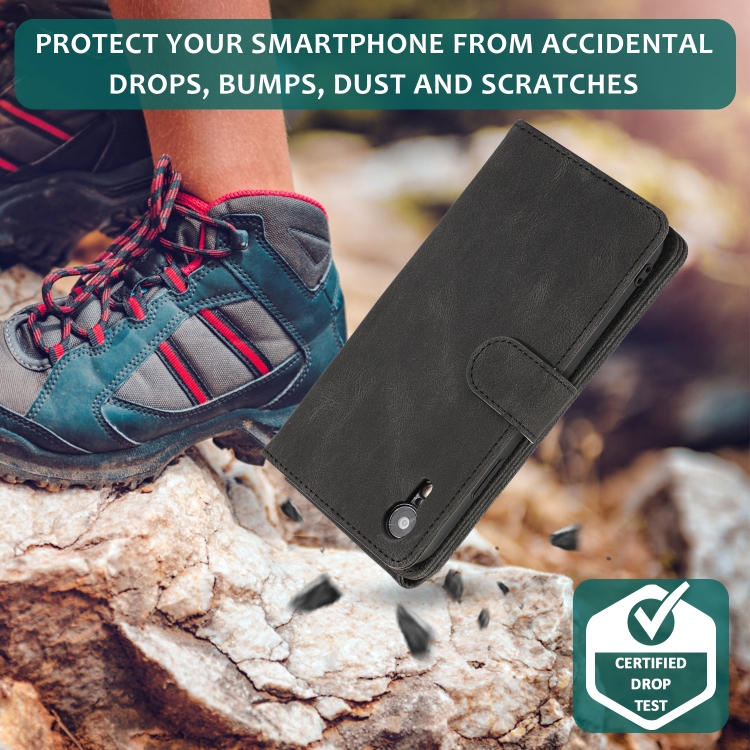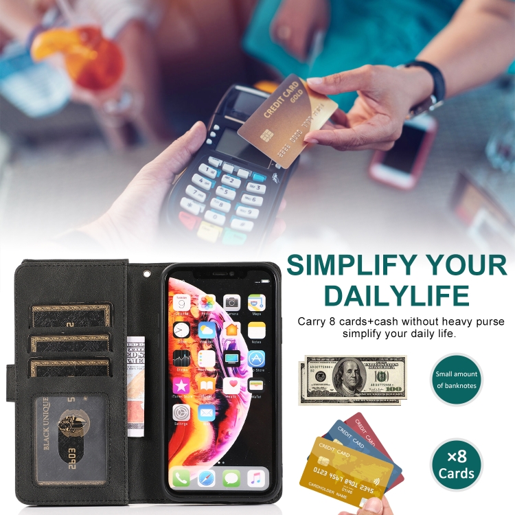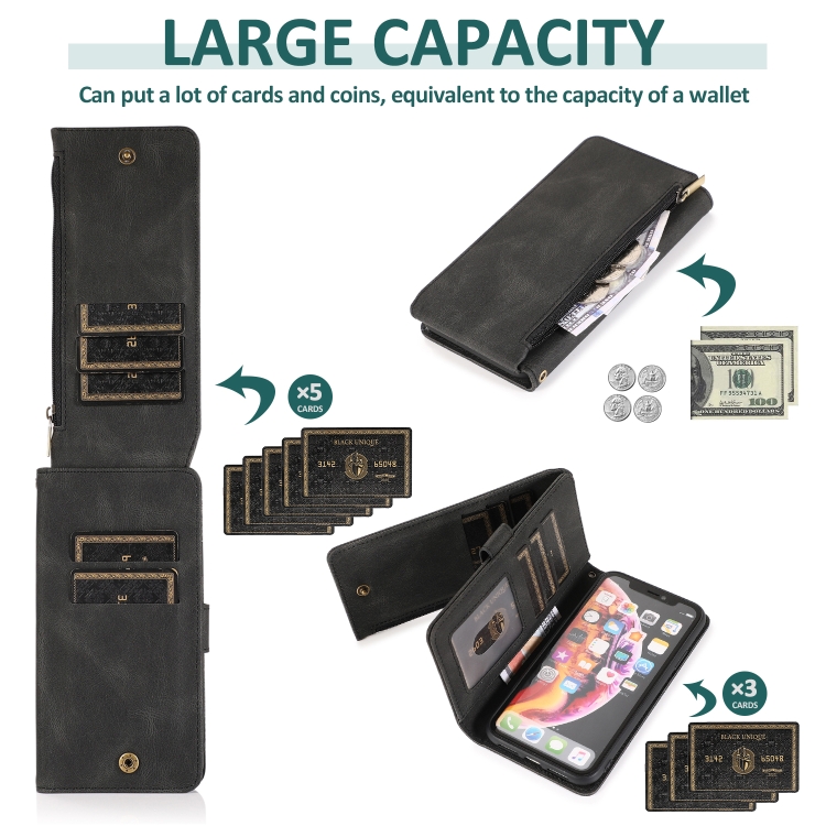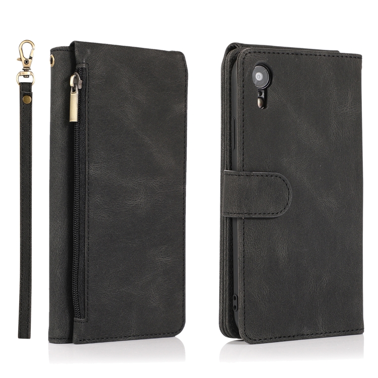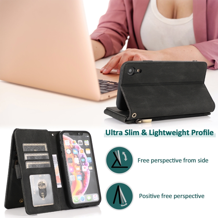 Funda para iPhone Xr Skin-Feel Crazy Horse Texture Zipper Wallet Bag Cuero con Tapa Horizontal Soporte Ranuras y Cordón (Negro)
