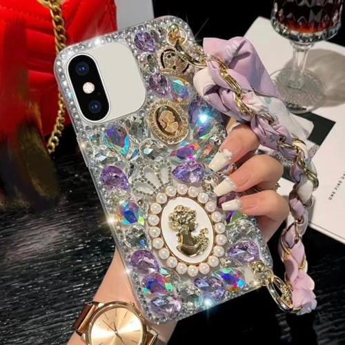 Caja de teléfono para iPhone Xs Max PC pulsera bufanda piedra preciosa púrpura diamante hecho a mano (Blanco)