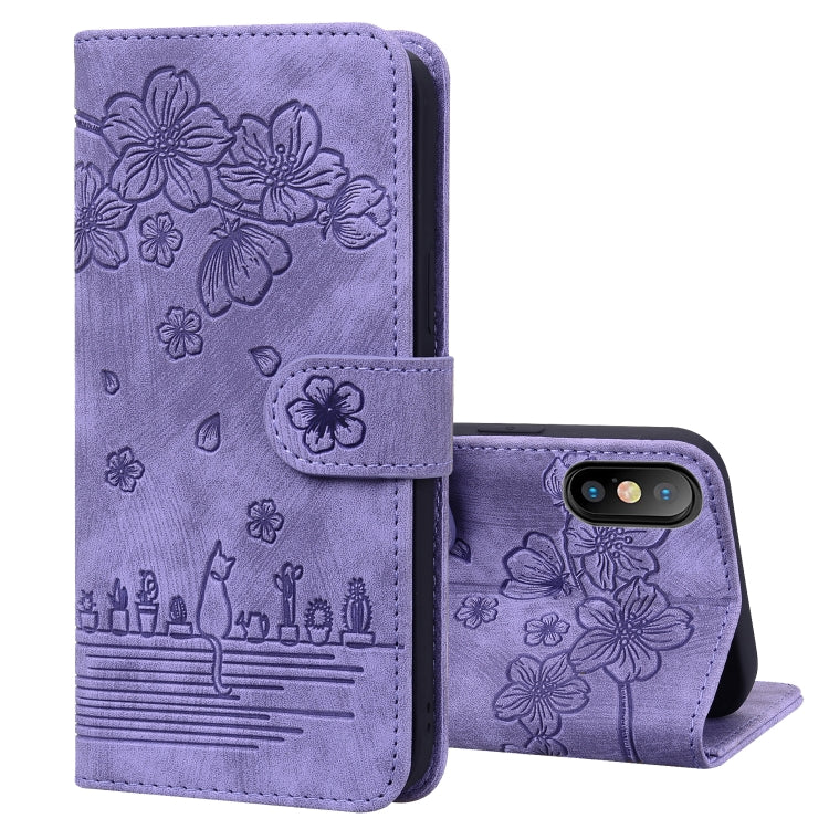 Estuche de Cuero para iPhone Xs Max Cartoon Sakura Cat En Relieve (Púrpura)