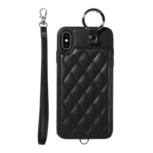 Estuche para teléfono iPhone Xs Max con bolsa para tarjetas textura rómbica y cordón corto (Negro)