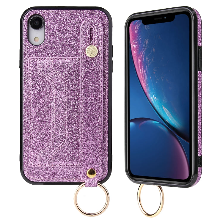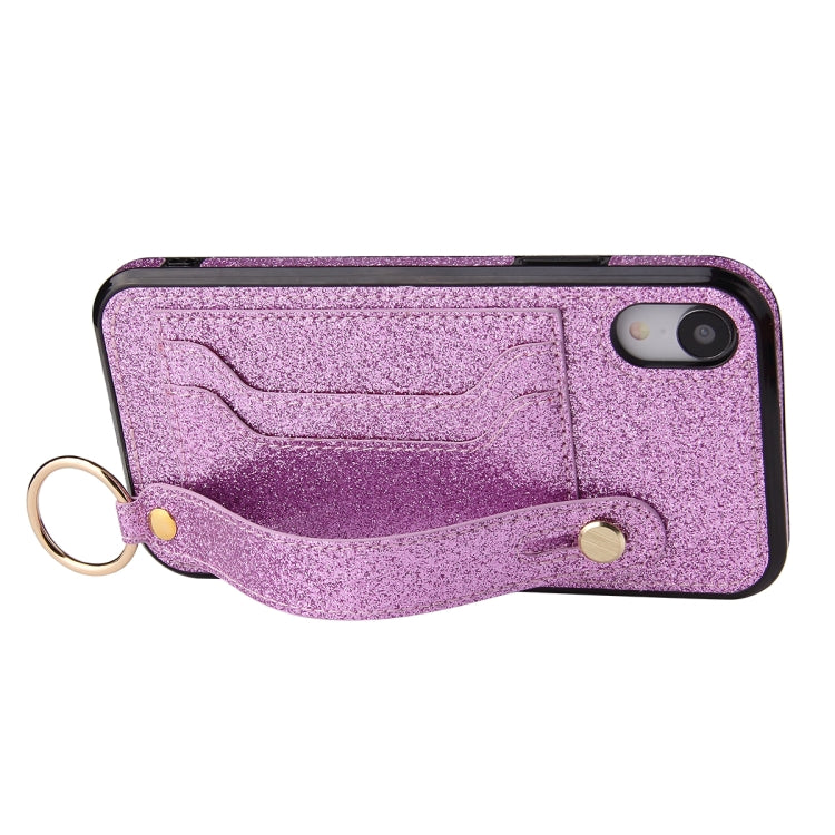 Estuche protector para iPhone Xs Max Glitter Powder PU + TPU con soporte, ranuras para tarjetas y correa para la muñeca (Púrpura)