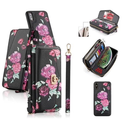 Funda de Cuero Pola Flower para iPhone Xs Max con Billetera Cruzada Multifuncional y Cremallera (Negro)