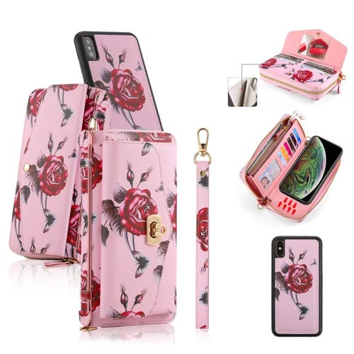 Funda de Cuero Pola Flower para iPhone Xs Max con Billetera Cruzada Multifuncional con Cremallera (Rosa)