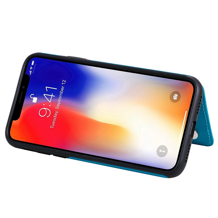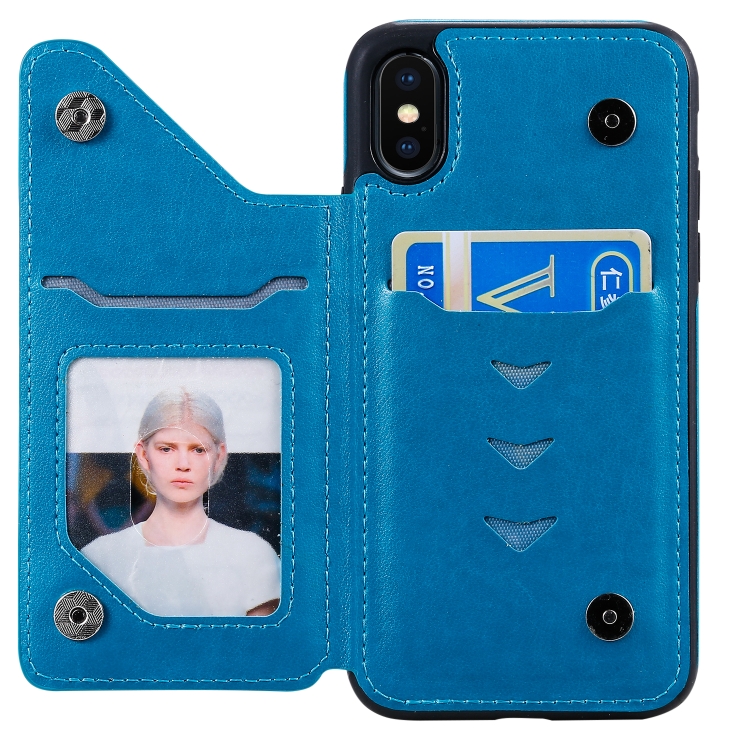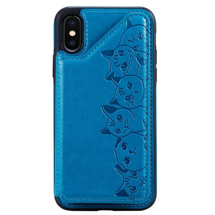 Estuche Protector Six Cats para iPhone Xs con Patrón de Relieve Soporte Ranuras para Tarjetas y Marco de Fotos (Azul)
