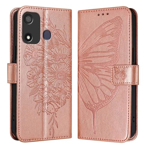Funda de Cuero para Itel P17 y A27 con Mariposa en Relieve (Oro Rosa)