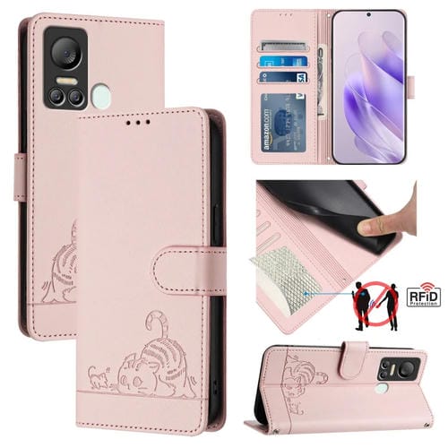 Estuche para Itel S18 y Vision 5 Cat Rat de Cuero RFID con Patrón en Relieve y Cordón (Rosa)