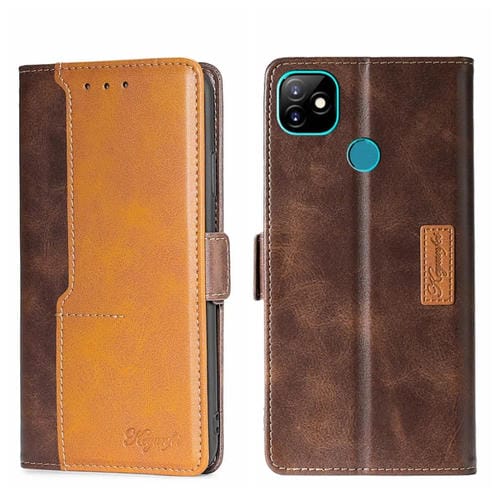 Caja de Teléfono de Cuero para Itel Vision 1 con Hebilla Lateral y Color de Contraste (Marrón Oscuro + Dorado)