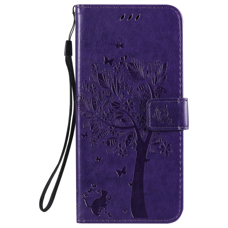 Funda de Cuero para LG K51 con Tapa Horizontal, Patrón Árbol y Gato, Soporte, Ranuras y Cordón (Púrpura)