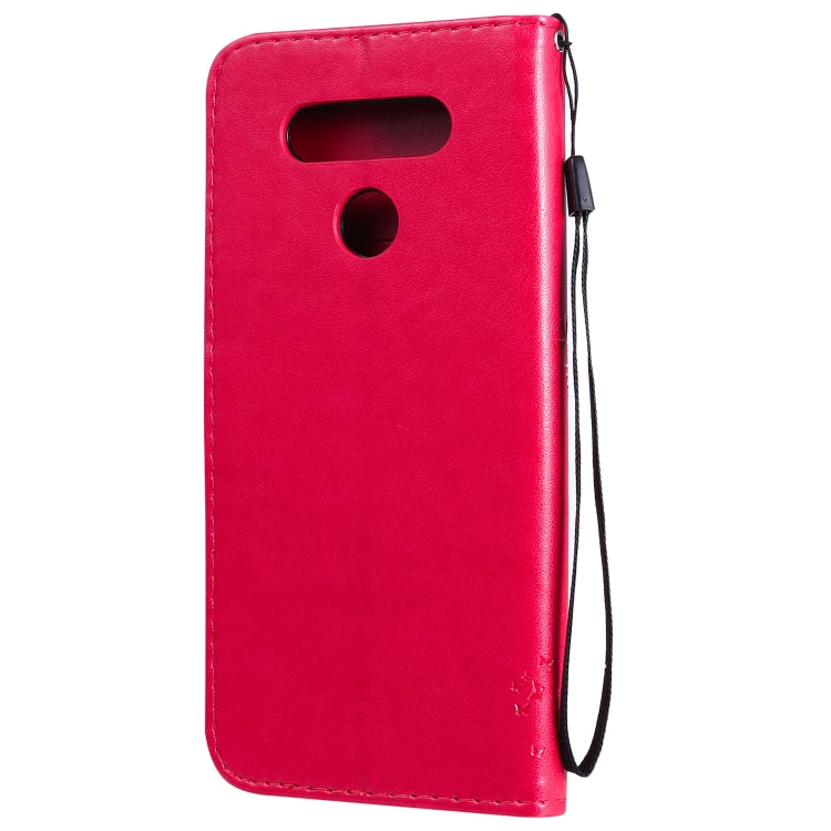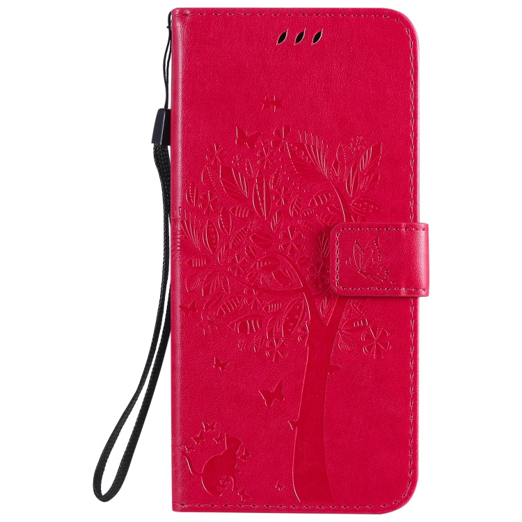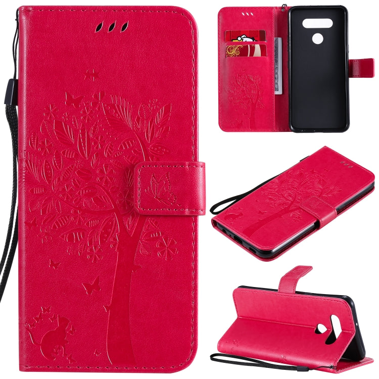 Funda de Cuero para LG K51 Tree & CAT con Tapa Horizontal, Soporte, Ranuras para Tarjetas, Billetera y Cordón (Rosa Roja)