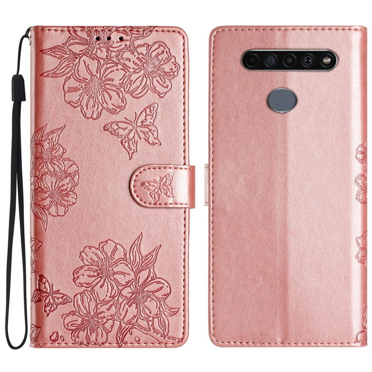 Funda para LG K61 Cherry Blossom Butterfly Skin Feel de PU en Relieve (Oro Rosa)