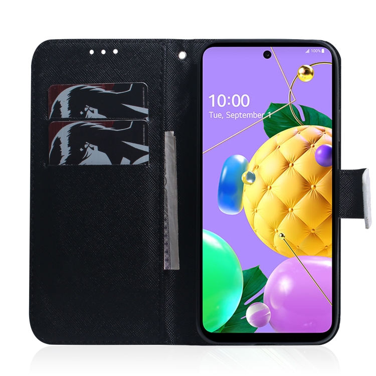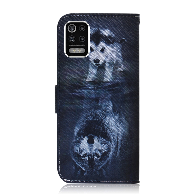 Funda de Cuero Abatible para LG K62 K52 Q52 con Soporte, Ranuras y Billetera (Lobo y Perro)