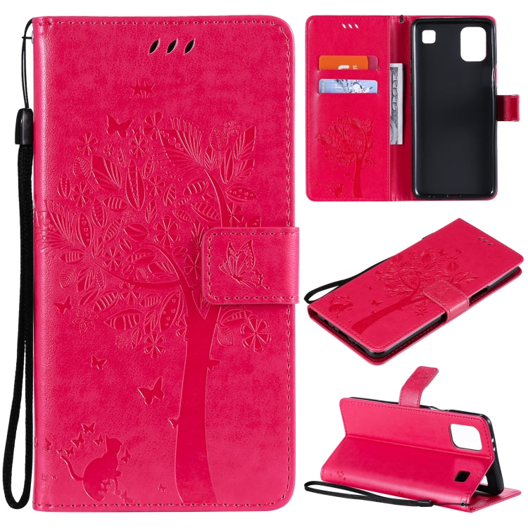 Funda para LG K92 5G con patrón Árbol y Gato, Cuero PU, Soporte, Ranuras y Cordón (Rose Rojo)