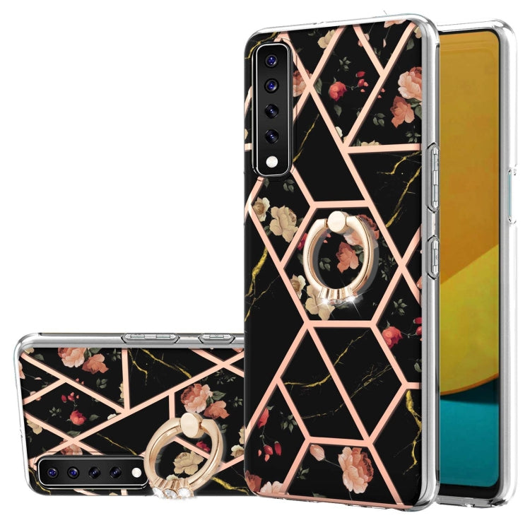 Funda TPU para LG Stylo 7 con Patrón de Flores de Mármol, Electrochaplating y Soporte de Anillo (Flor Negra)