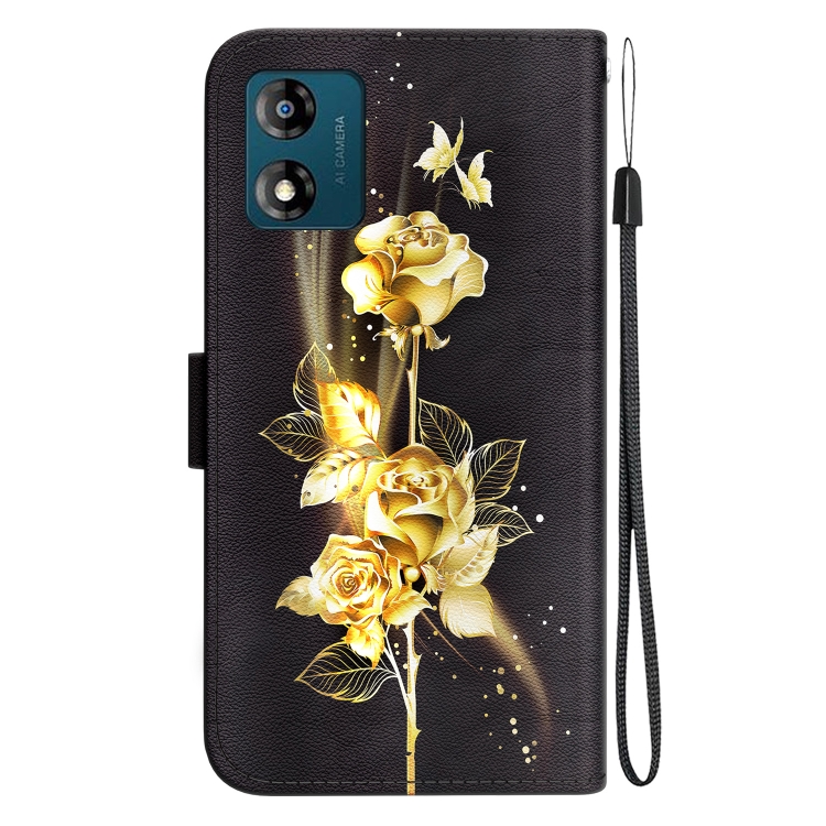 Funda de Cuero para Motorola Moto E13 con Dibujo Coloreado y Textura de Cristal (Mariposa Dorada Rosa)