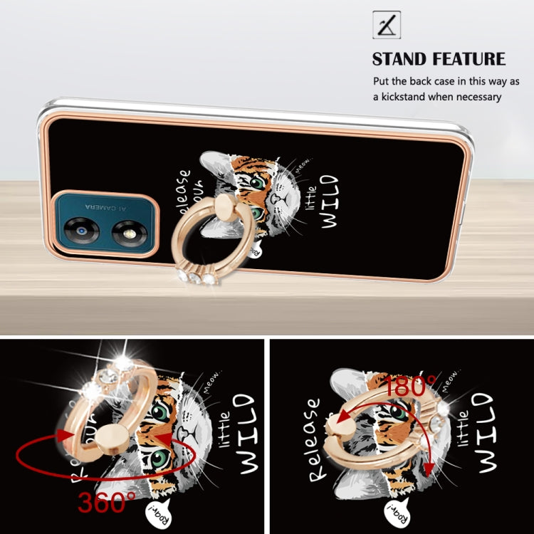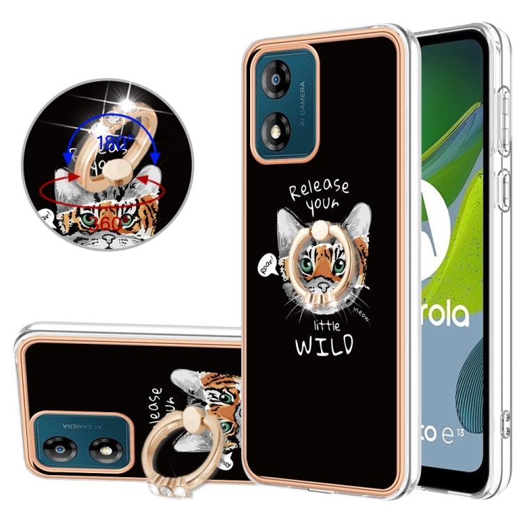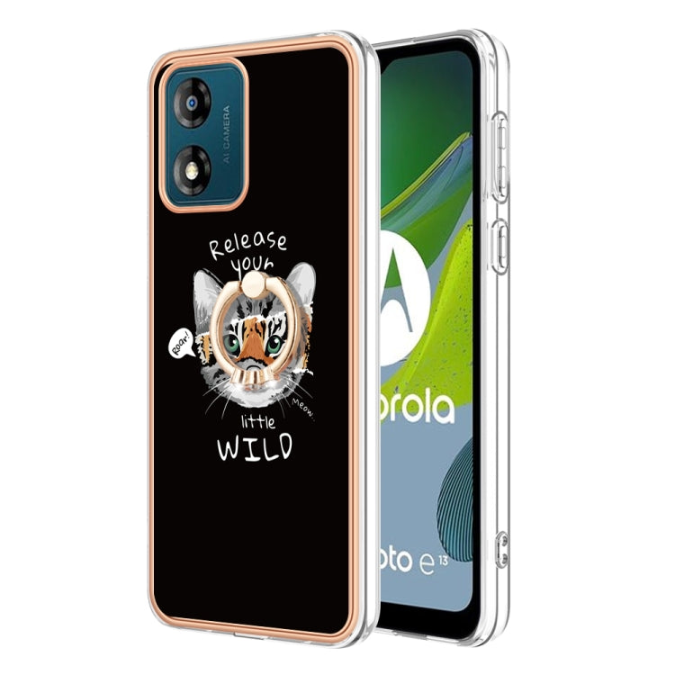 For Motorola Moto E13 Electroplating Double-sided IMD Phone Case with Ring Holder (Natural Growth)