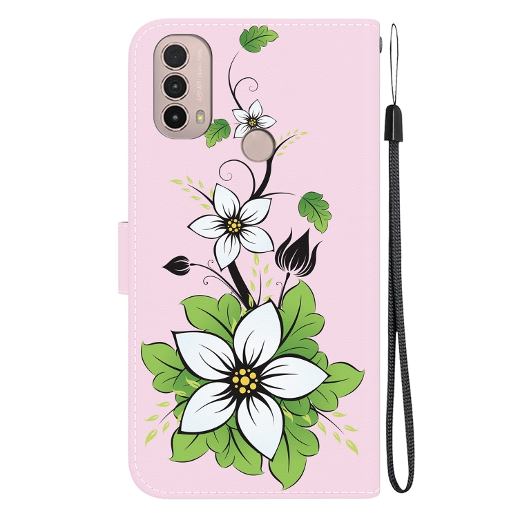 Funda de Cuero para Motorola Moto E20 E30 E40 con Dibujo Coloreado y Textura de Cristal (Lirio)