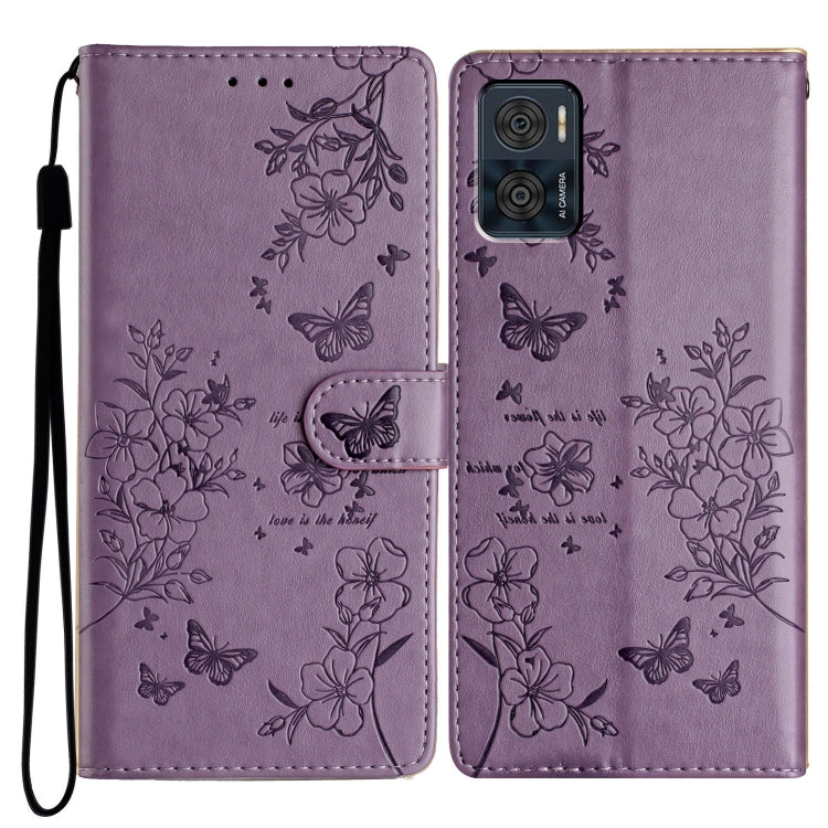Funda de Cuero para Motorola Moto E22 con Mariposas y Flores (Púrpura)