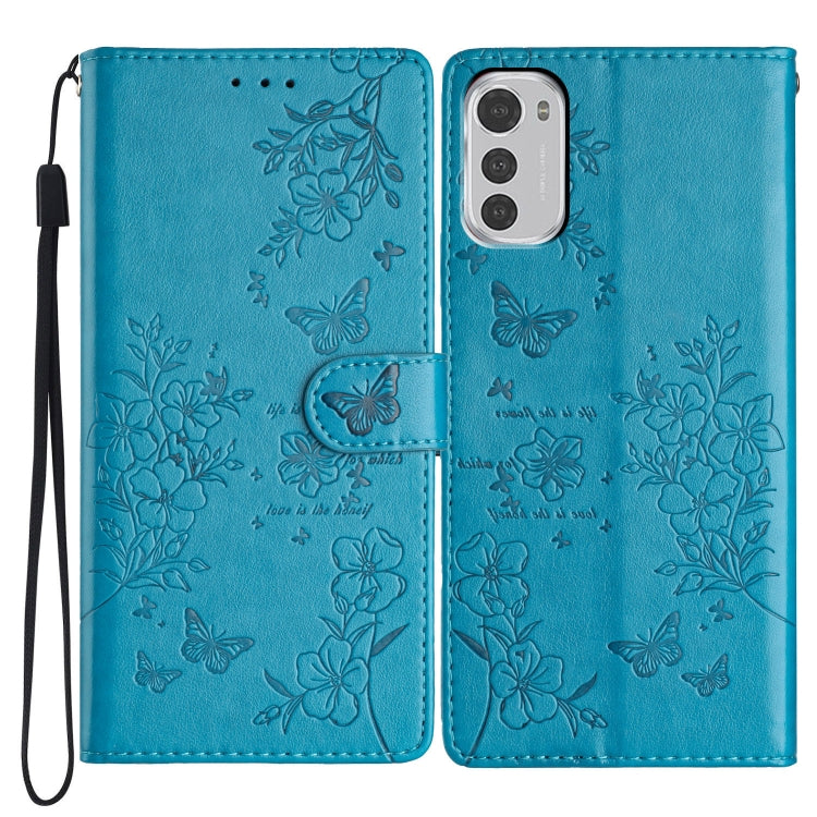 Funda de Cuero para Motorola Moto E32 con Mariposas y Flores (Azul)