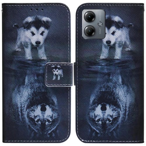 Funda de Cuero para Motorola Moto G14 con Tapa y Dibujo Coloreado (Lobo y Perro)