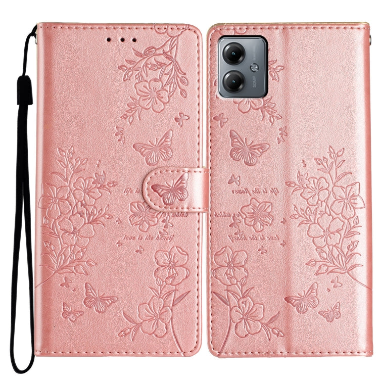 Funda de Cuero para Motorola Moto G14 con Mariposas y Flores (Oro Rosa)