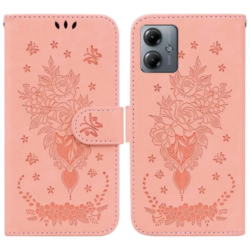 - 1x Funda para Motorola Moto G14 de Cuero con relieve Mariposa y Rosa (Rosa)