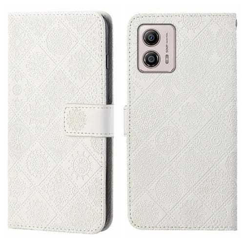 Funda de Cuero para Motorola Moto G53 con Patrón en Relieve Estilo Étnico (Blanco)